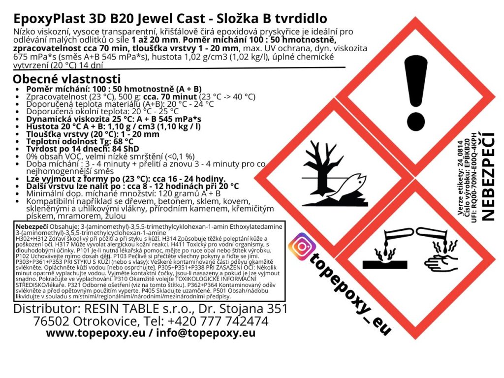 - EpoxyPlast 3D B20 Jewel Cast - Nízká viskozita, zpracovatelnost cca 55 min, pro drobné odlitky.